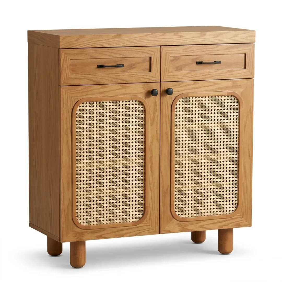 تصميم مميز بواجهة خوص مربعة تضيف طابع طبيعي دافئ ولمسة فريدة في الديكور. لون بني أرو يعزز الإحساس بالفخامة والعمق، مع مساحة تخزين مناسبة للعائلة.