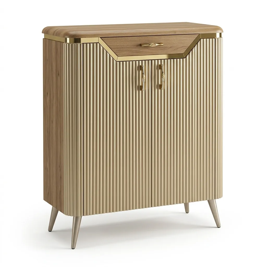 تصميم راقي بواجهة قشرة أنيقة ولمسة شامبين فخمة تضيف إحساس بالهدوء والرقي لمدخل منزلك. تجمع بين الشكل الديكوري المميز والمساحة العملية لتنظيم الأحذية بشكل مرتب وأنيق. قطعة مثالية لمحبي التفاصيل الهادئة والفخامة البسيطة.