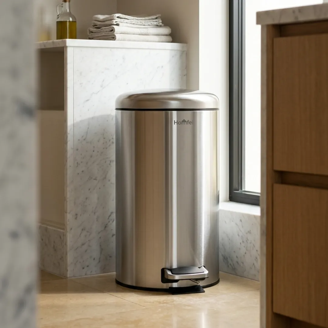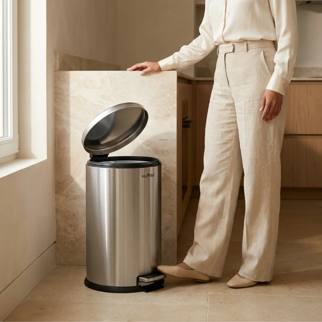 سلال مهملات هومفل مصنوعة من ستيل عالي الجودة، بتصميم دائري عصري يناسب مختلف الديكورات، مع دواسة لفتح الغطاء بسهولة وبدون لمس لراحة ونظافة أكبر.