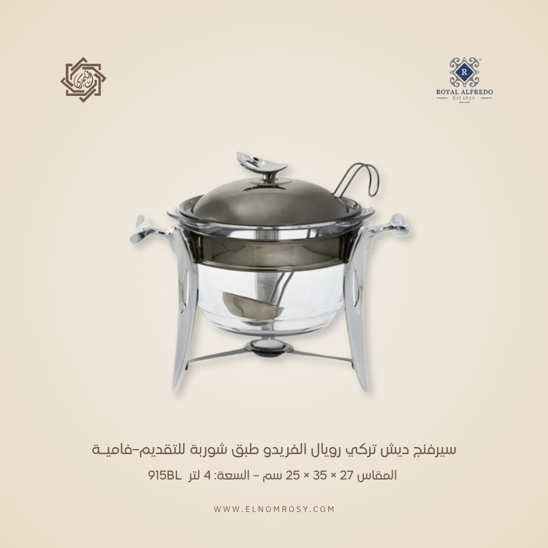 اجعلي عزوماتك ترتقي إلى مستوى أرقى الفنادق مع سيرفنج ديش رويال ألفريدو، المصنوع من الستانلس ستيل التركي 18/10 عالي الجودة، ليمنحك تجرب تقديم تجمع بين الفخامة والمتانة في آن واحد.