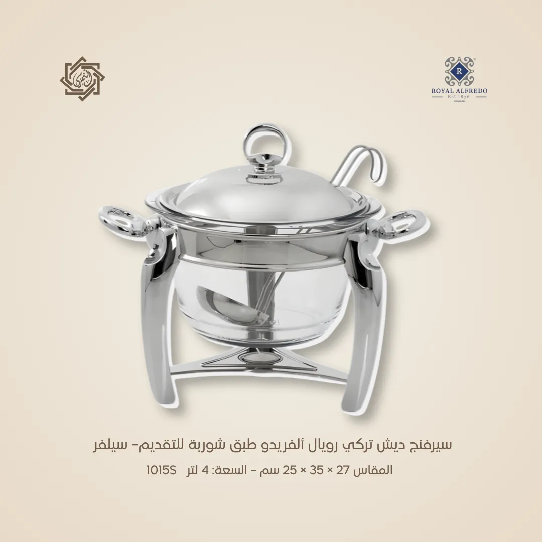 اجعلي عزوماتك ترتقي إلى مستوى أرقى الفنادق والأوتيلات مع سيرفنج ديش رويال ألفريدو، المصنوع من الستانلس ستيل التركي 18/10 عالي الجودة، ليمنحك مزيجًا مثاليًا من الفخامة والمتانة في آن واحد.
