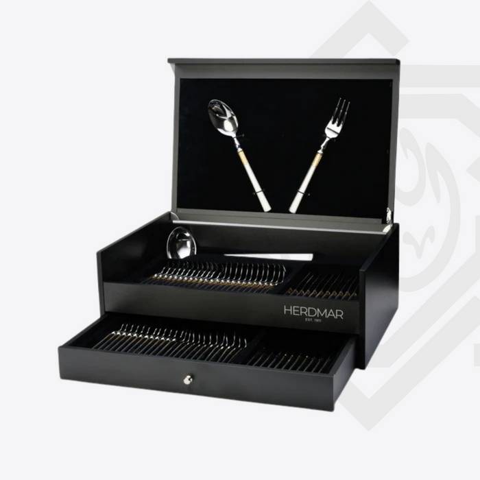 أطقم هيردمار مصنوعة من أجود أنواع الاستانلس ستيل 18/10، لتمنحك مزيجا مثالياً من المتانة والفخامة. تم تصميمها وفقًا لأعلى معايير الجودة بعد دراسة دقيقة لابتكار أشكال مريحة تلبي احتياجات أدوات المائدة العصرية. كل قطعة تحمل بصمة هيردمار المميزة لتزين سفرتك بأناقة في جميع مناسباتك. الطقم مكوَّن من 75 قطعة تكفي لاستخدام 12 شخص.