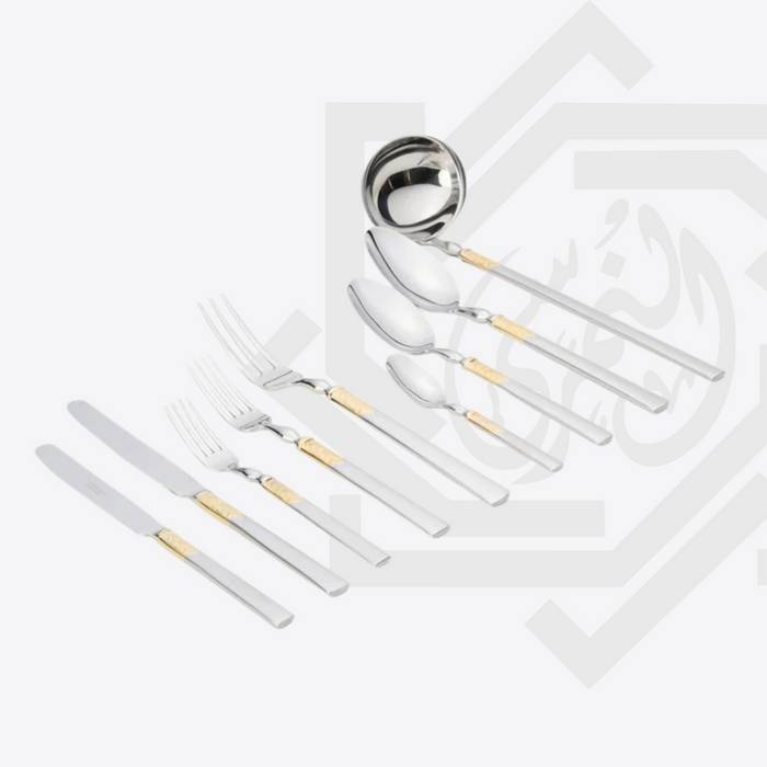 ١ مغرفة شوربة • ١ معلقة غرف • ١ شوكة غرف • ١٢ ملعقة كبيرة • ١٢ شوكة كبيرة • ١٢ سكينة كبيرة • ١٢ سكينة صغيرة • ١٢ شوكة صغيرة • ١٢ ملعقة صغيرة