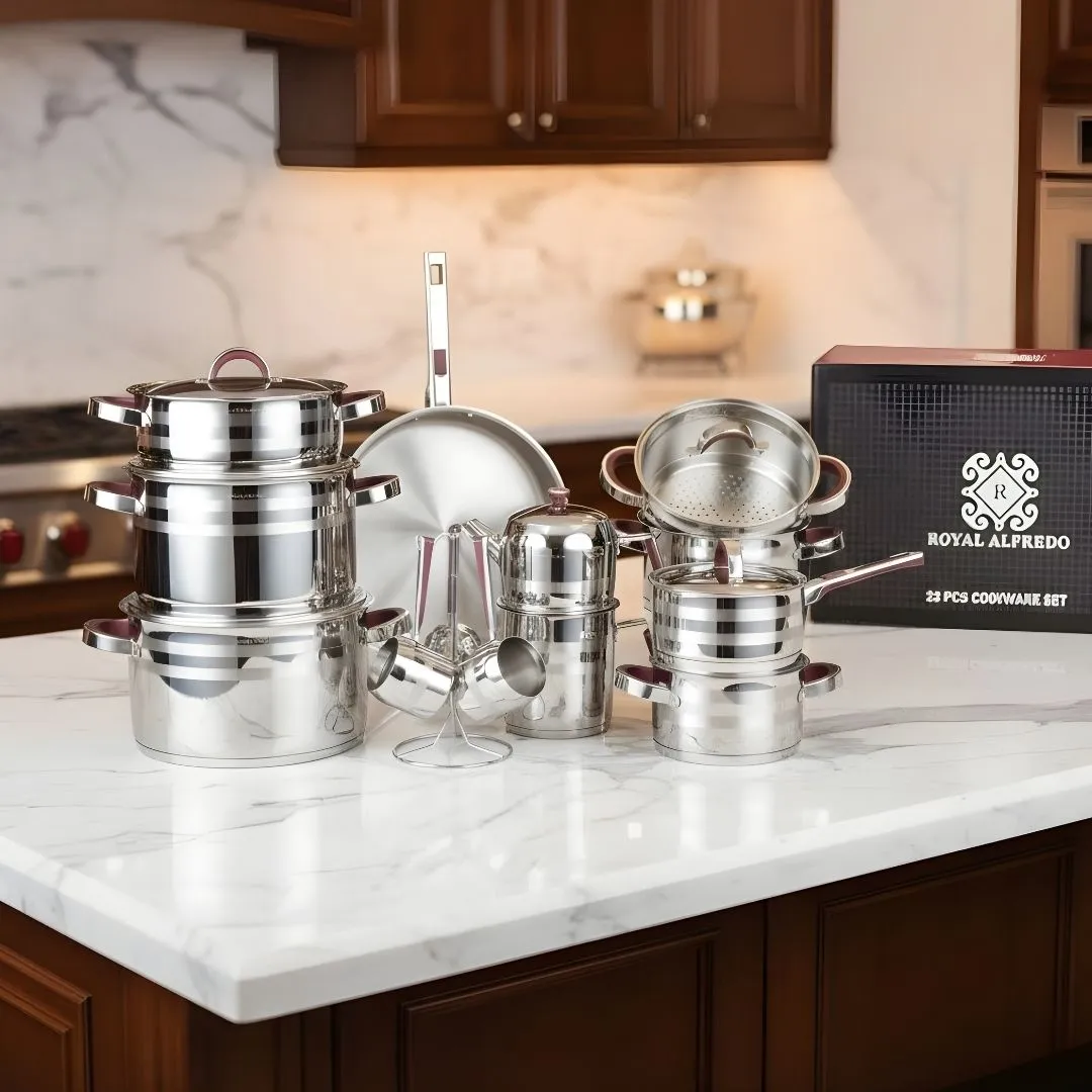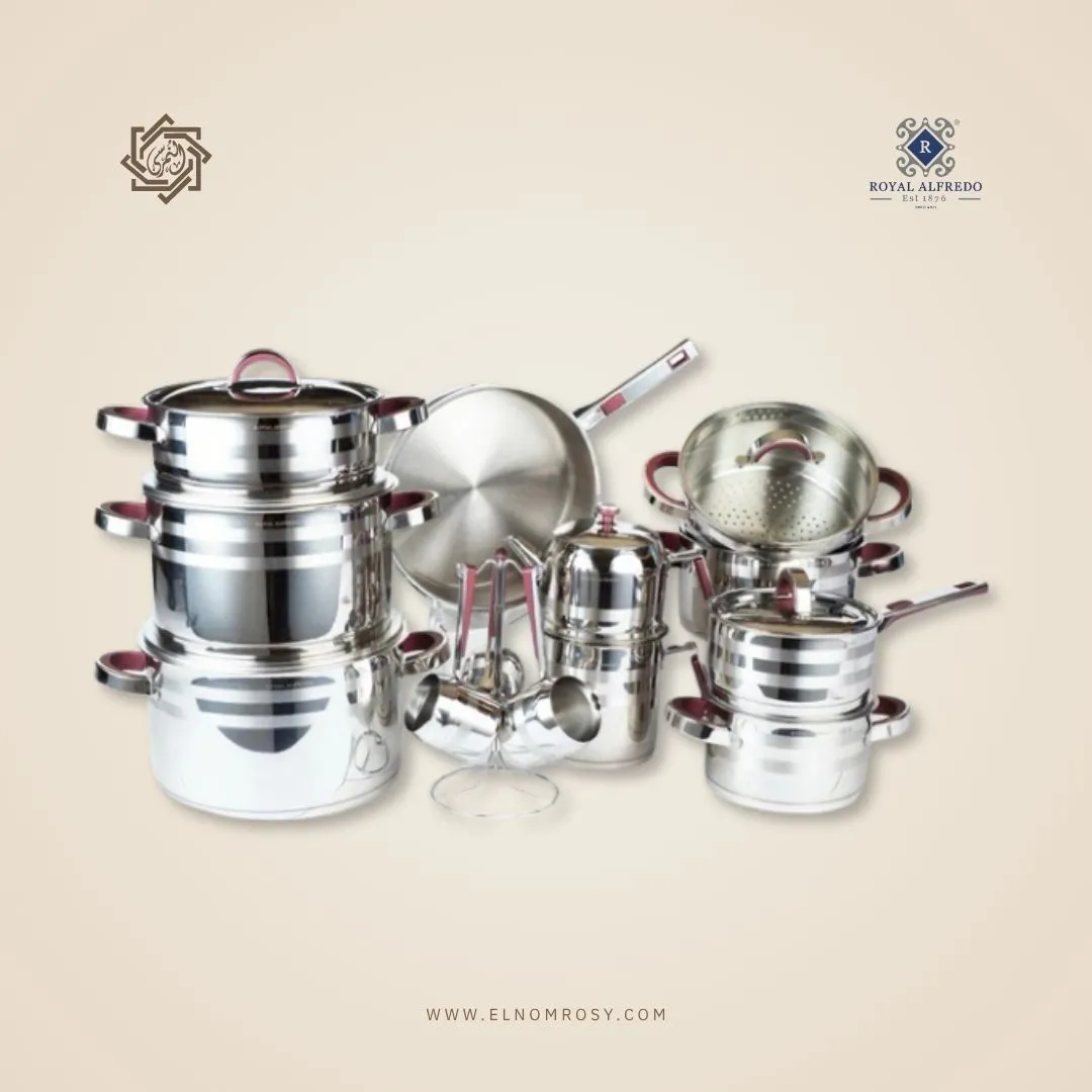 طقم حلل متكامل يجمع بين الجودة العالية والتصميم العملي الأنيق، مناسب للاستخدام اليومي والعزومات، ويمنحك تجربة طهي مريحة ونتائج مثالية كل مرة.