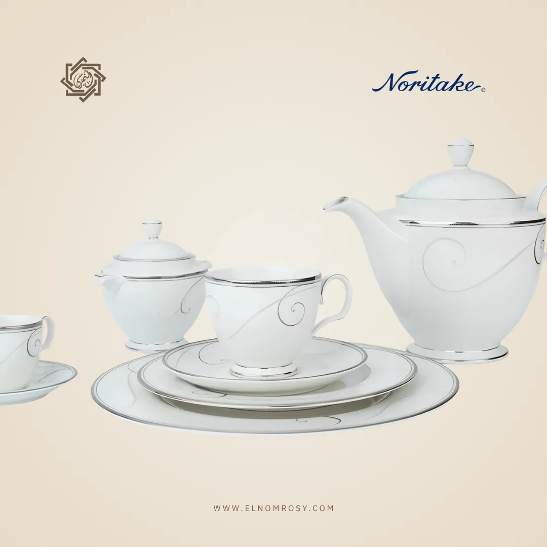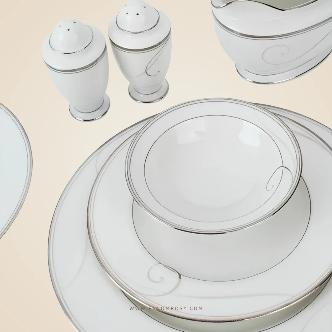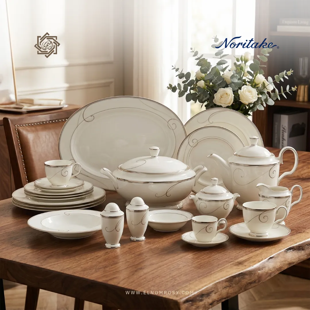 طقم سفرة نوريتاكي ١١٢ قطعة مصنوع من البورسلين عالي الجودة، بتصميم يجمع بين نقاء اللون الأبيض ولمعان الفضي بشكل أنيق ومتناسق يناسب العزومات الكبيرة وأجمل التجمعات العائلية.