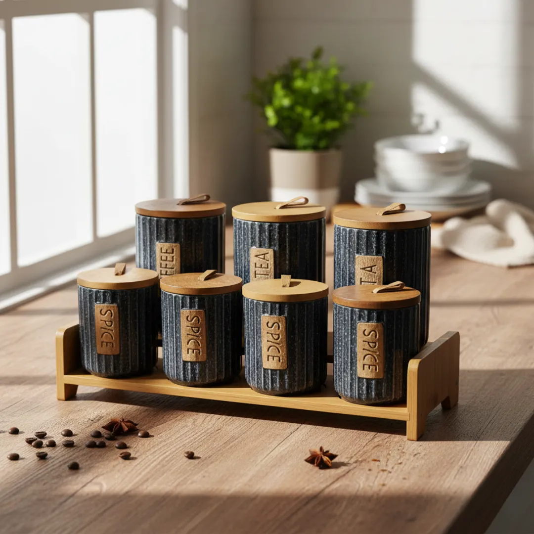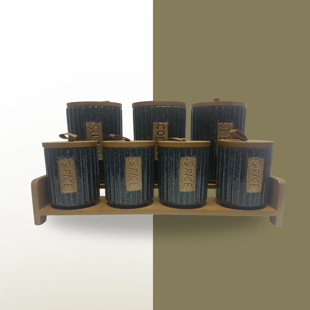 طقم توابل 7 قطعه من البورسلين بغطاء بامبو +استاند بامبو