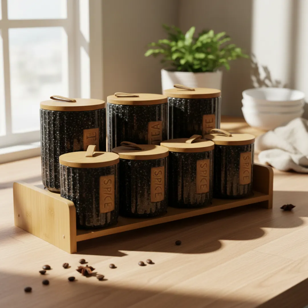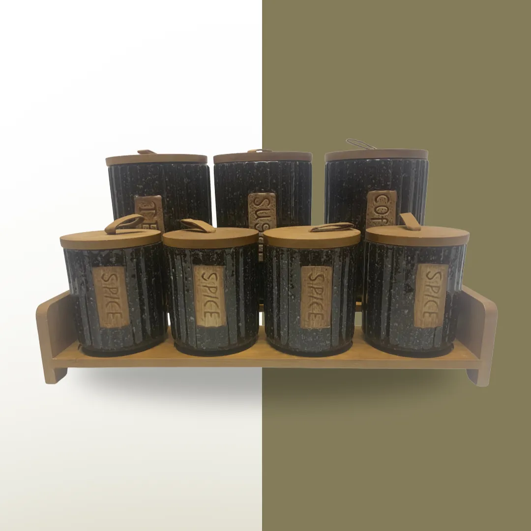 طقم توابل 7 قطعه من البورسلين بغطاء بامبو +استاند بامبو