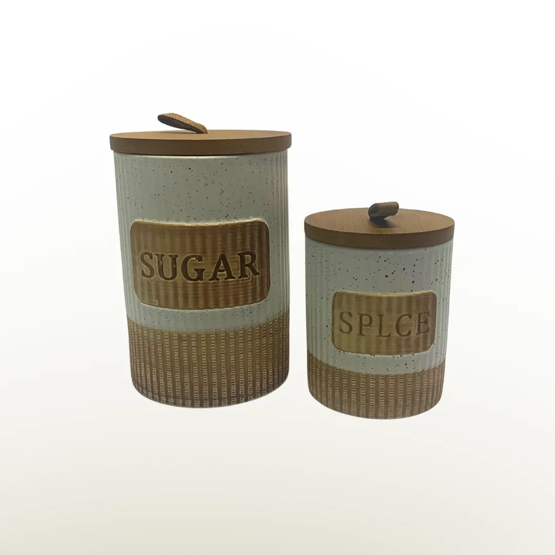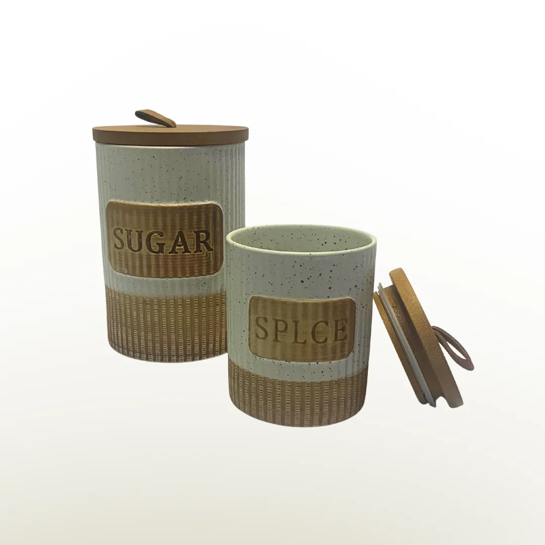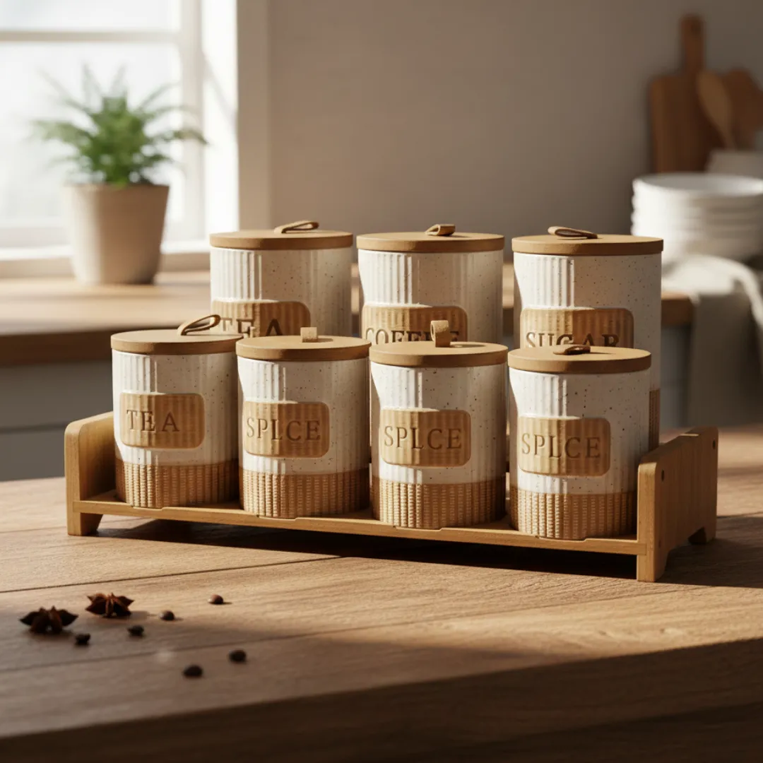 طقم توابل 7 قطعه من البورسلين بغطاء بامبو +استاند بامبو